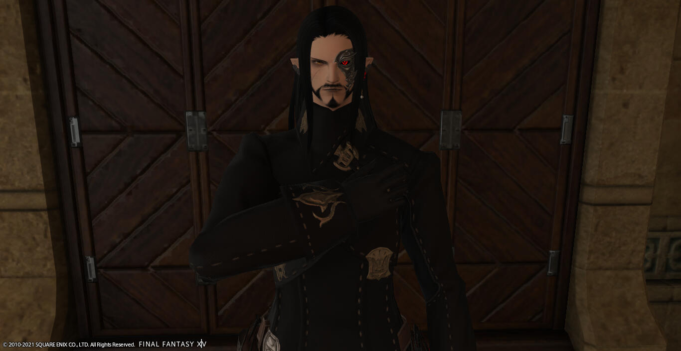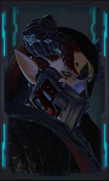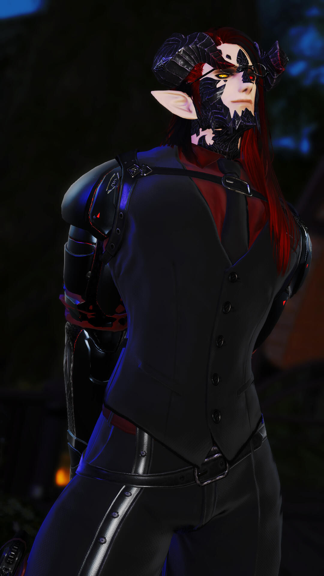 He stands towering above even most Au Ra by at least a head, making him easy to spot in a crowd, as much as he secretly hates this.With fair facial features rather typical of an Elezen, his otherwise charming appearance is marred by metal plating primarily on the left side of his face, a glowing crimson 'eye' a stark contrast to the other soft golden eye. He frequently uses trinkets or charms pre-enchanted with glamouring magic to hide the plating, though the crimson eye remains visible.