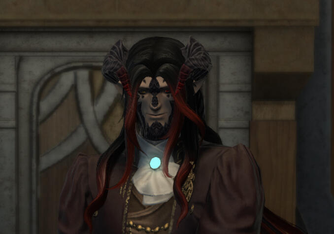His 'horns' sit rather high up on his head, with a pair of pointed ears settled beneath. Elezen? Au Ra? Both?